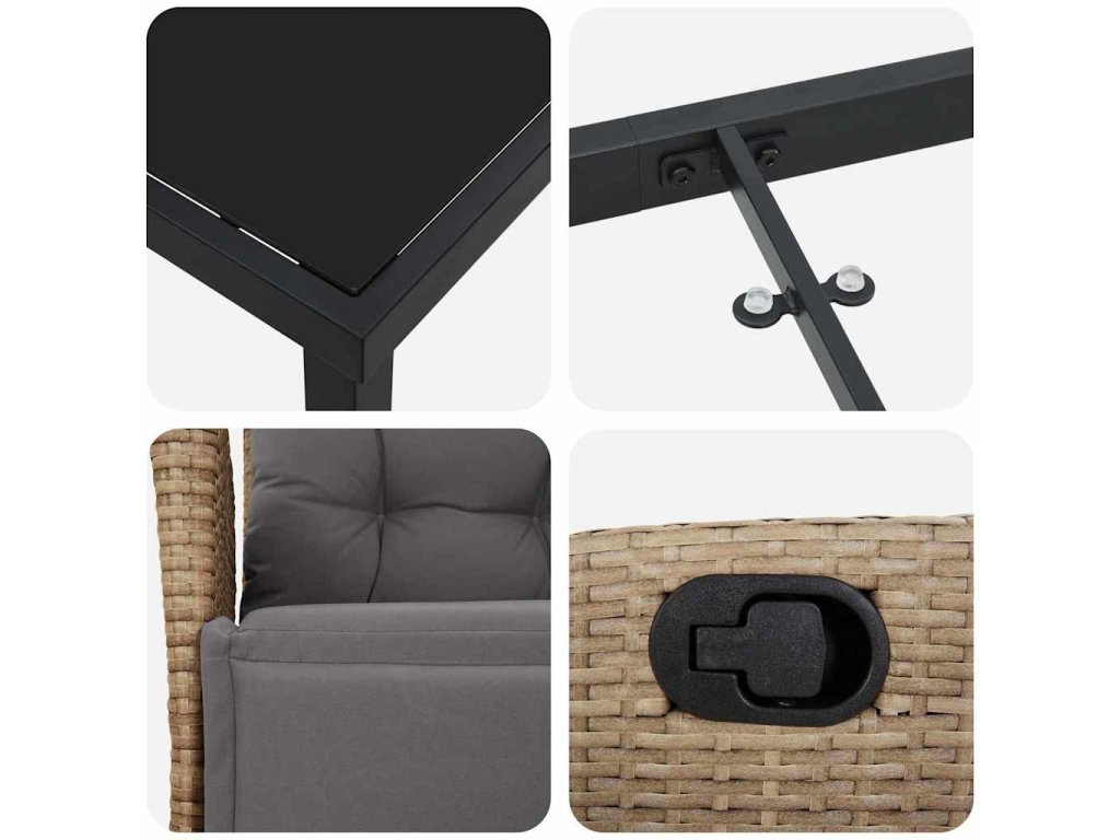 - Stavba z poly ratanu a oceli Jídelní set je vyroben z poly ratanu a práškově lakované oceli, takže vydrží i nepřízeň počasí a vypadá skvěle. Poly ratan dává moderní vzhled a drží stabilitu při používání.