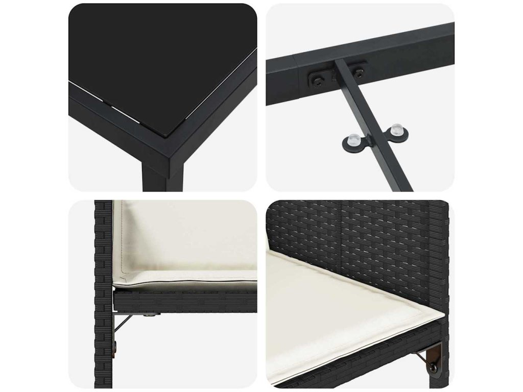 - Vysoce kvalitní materiály: Jídelní set obsahuje odolný poly ratan, který dodává sofistikovaný vzhled a zajišťuje dlouhou životnost venku. Povrch z tvrzeného skla nabízí eleganci a praktičnost, což usnadňuje čištění a údržbu. Společně tvoří vizuálně atraktivní a robustní kompozici ideální pro venkovní stolování.