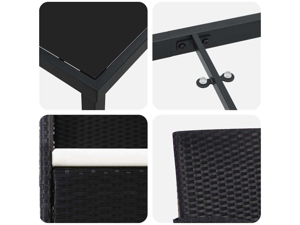 - Materiály: Tento jídelní set se pyšní odolným polyratanem a tvrzeným sklem, které odolávají povětrnostním vlivům. Tato kombinace skvěle vypadá a vydrží i tu nejhorší sezonu.