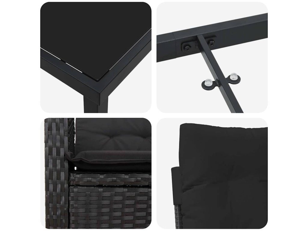 - Materiály: Set je vyrobený z poly ratanu a odolné oceli, zajišťující trvanlivost a eleganci. Poly ratan se přirozeně brání UV záření a špatnému počasí, takže je ideální na slunečné dny, a ocelový rám dodává pevnost a stabilitu pro dlouhodobé používání.