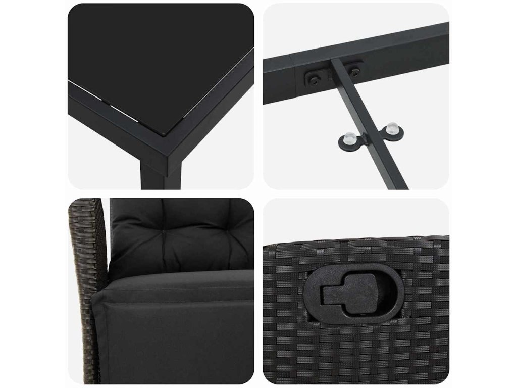 - Stavba z poly ratanu a oceli Jídelní set je vyroben z poly ratanu a práškově lakované oceli, takže vydrží i nepřízeň počasí a vypadá skvěle. Poly ratan dává moderní vzhled a drží stabilitu při používání.