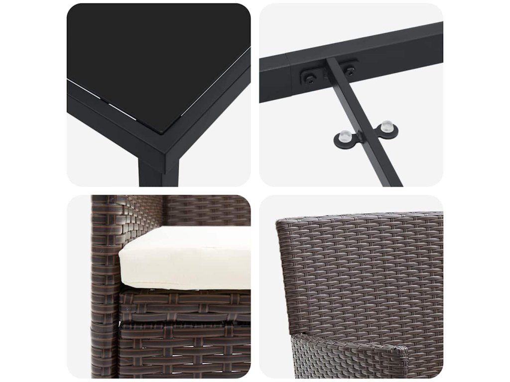 - Poly ratanová opěradla a opěrky rukou: Otočná poly ratanová vlákna v opěrách a rukou spojují styl a pohodlí, s ergonomickou oporou. Poly ratan je známý svou UV odolností, ideálním pro udržení svěžího vzhledu i při přímém slunci, takže set zůstane atraktivní celý rok.