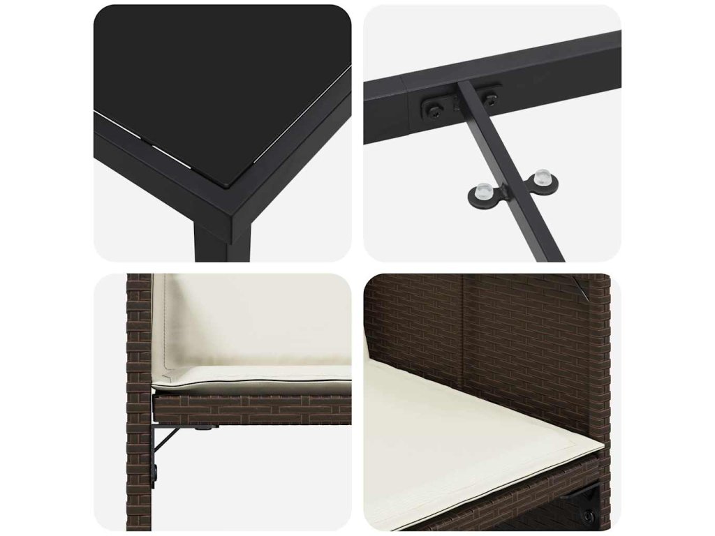 - Komfort se stylem: Pohodlné polštáře obohatí sezení pro příjemné odpoledne nebo večery. Jsou odolné vůči počasí a přidávají měkkost k robustní ratanové konstrukci.