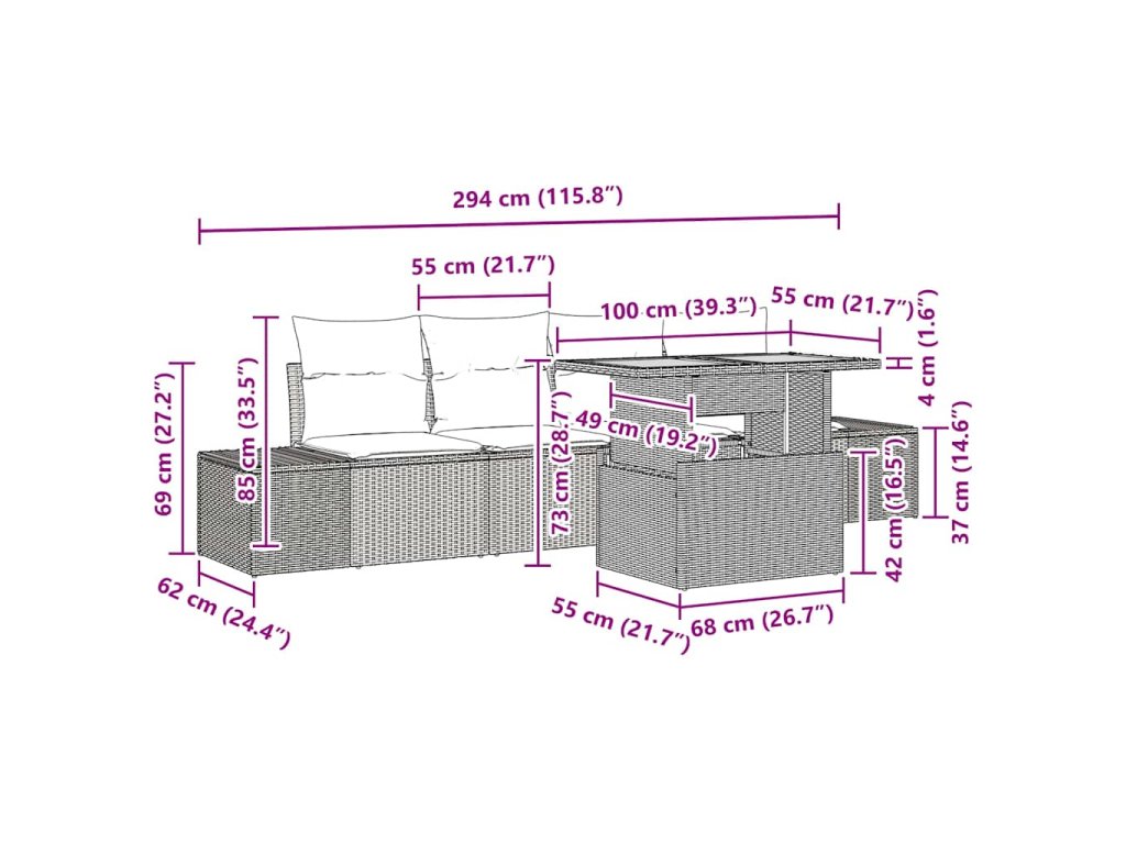 - Obsahované komponenty: Sada zahrnuje dvě boční pohovky a dvě centrální sedadla, z nichž každé má praktickou úložnou funkci. Tento promyšlený design zvyšuje funkčnost a umožňuje snadné uložení venkovních potřeb a udržení prostoru v pořádku, ideální pro moderní venkovní život.