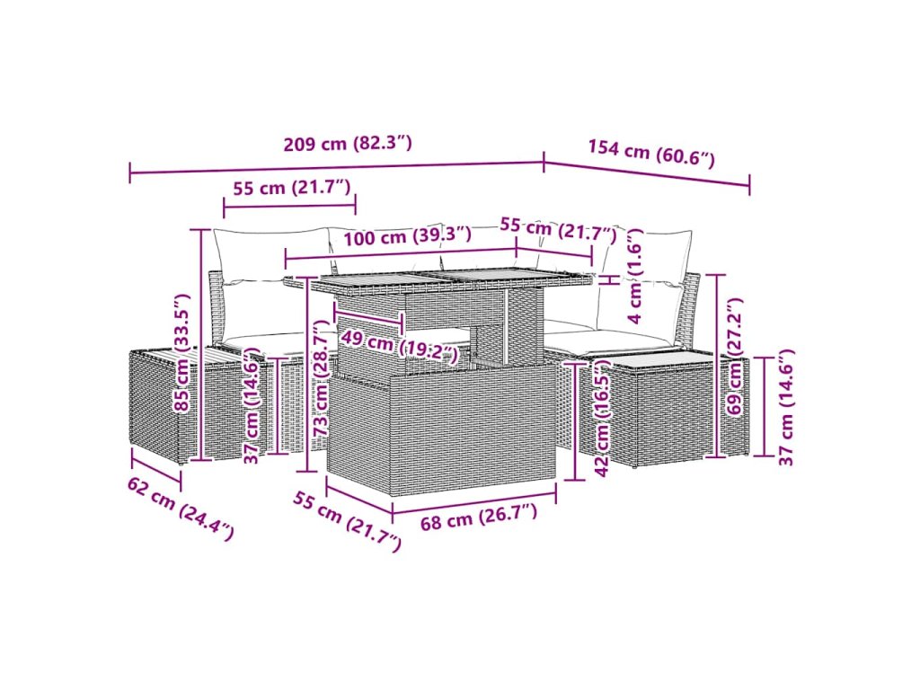 - Co je součástí: Set věrně obsahuje dvě boční sofa, rohové křeslo, středové křeslo a zahradní stůl. Každý kus má úložný prostor, což je praktické.