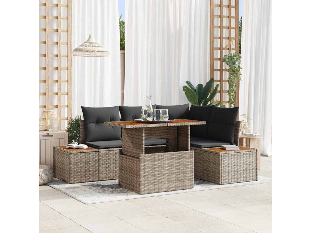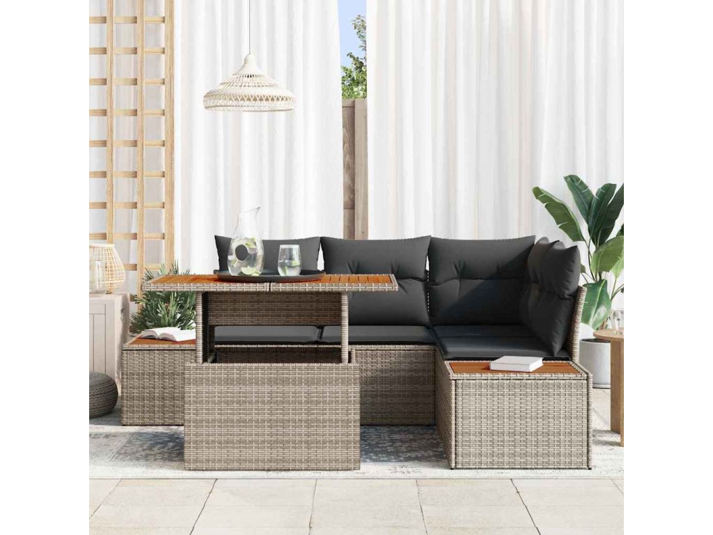 - Špičkové materiály: Je vyrobený z polyratanu, práškově lakované oceli a masivního akáciového dřeva, takže je připravený na venkovní použití. Tyhle materiály dodávají super pevnost a pěkný vzhled, což zajistí dlouhou životnost.
