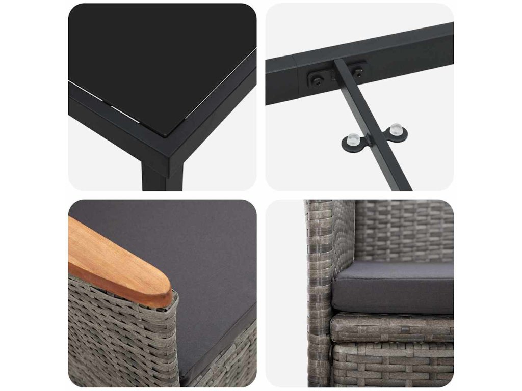 - Polyratanová řemeslná zpracování: Set je skvěle vyrobený z kvalitního polyratanu, který je nejen hezký, ale taky odolný vůči UV záření, dešti a opotřebení. Je lehký, takže se snadno přesouvá a skladuje, a vy se můžete bez obav těšit na venkovní zážitky s minimalizací údržby.