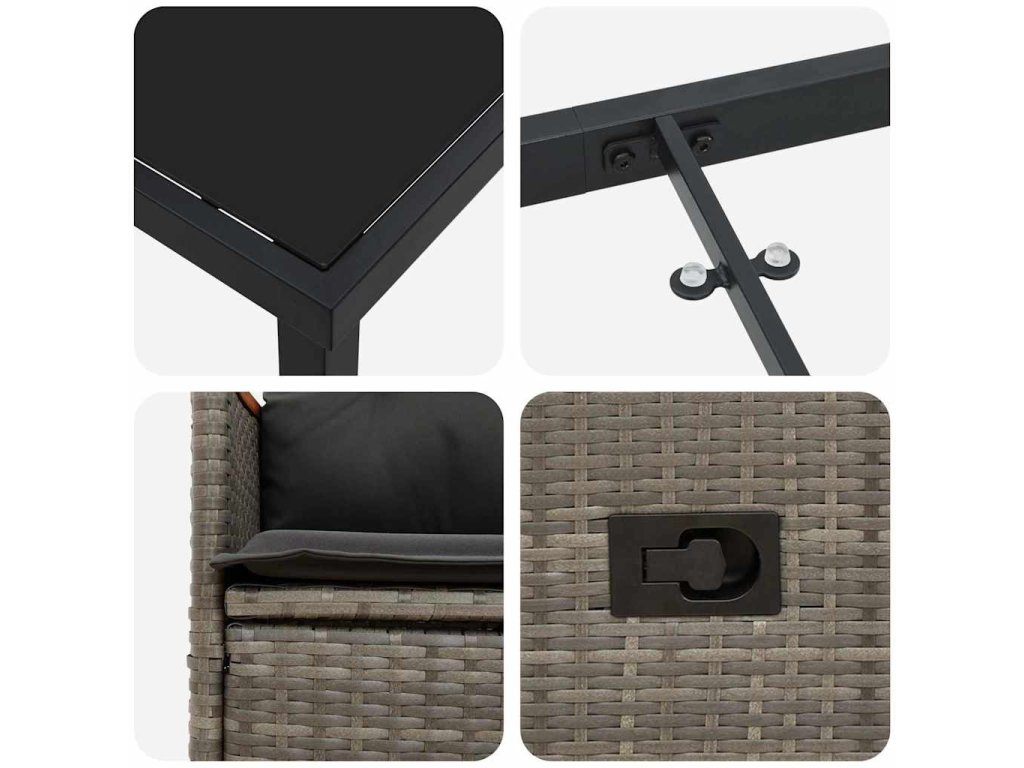 - Moderní design: Tento zahradní set má minimalistický design s práškově lakovaným ocelovým rámem a poly ratanovými povrchy. Dodává prostoru styl a eleganci.