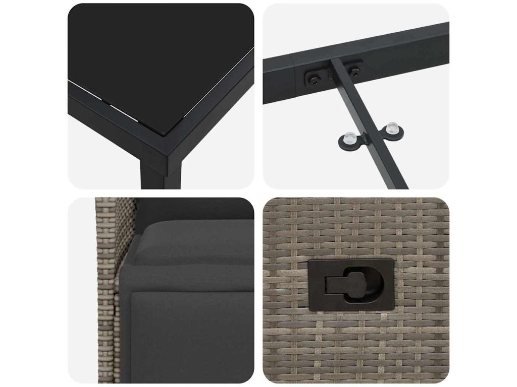 - Moderní design: Tento zahradní set má minimalistický design s práškově lakovaným ocelovým rámem a poly ratanovými povrchy. Dodává prostoru styl a eleganci.