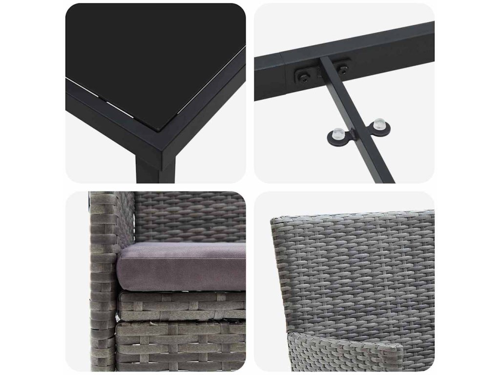 - Stolek s temperovaným sklem: Stůl se silným skleněným povrchem nabízí elegantní, snadno omyvatelný jídelní prostor, odolný proti opotřebení. Skleněný design dodává moderní nádech a hladce zapadá do minimalistického venkovního prostoru, který se soustředí na funkčnost bez ztráty stylu.