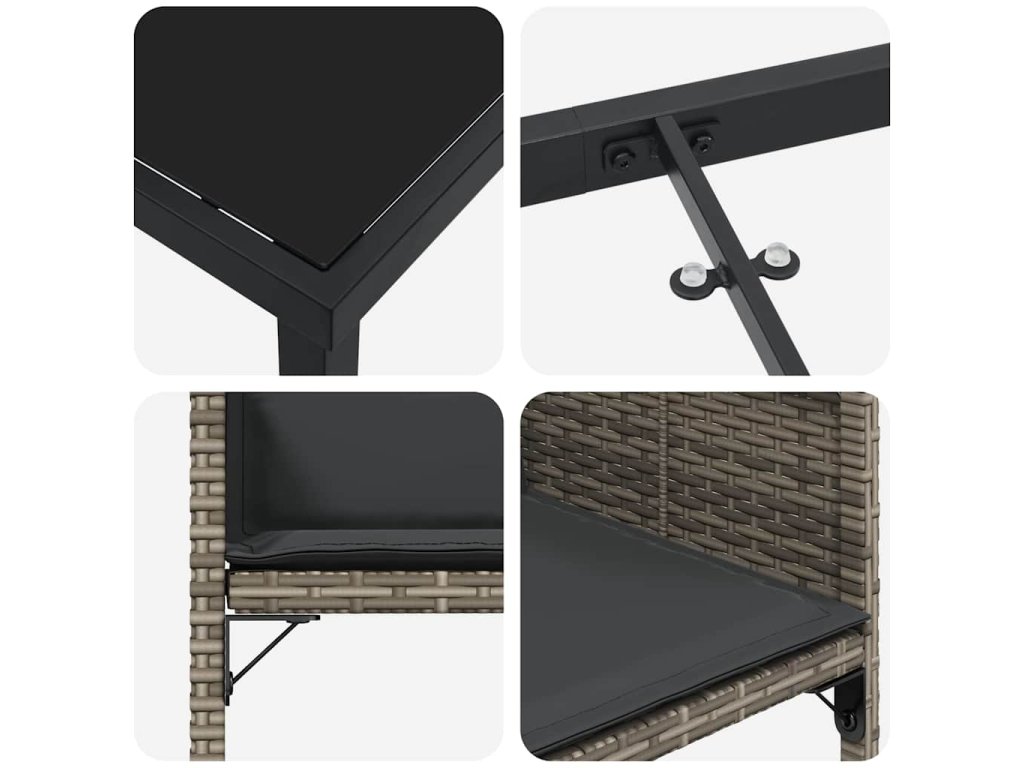 - Vysoce kvalitní materiály: Jídelní set obsahuje odolný poly ratan, který dodává sofistikovaný vzhled a zajišťuje dlouhou životnost venku. Povrch z tvrzeného skla nabízí eleganci a praktičnost, což usnadňuje čištění a údržbu. Společně tvoří vizuálně atraktivní a robustní kompozici ideální pro venkovní stolování.