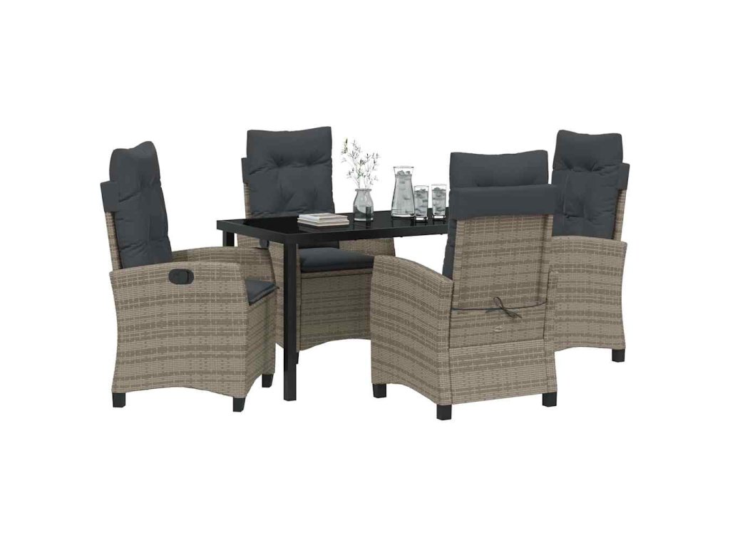- Materiály: Set je vyrobený z poly ratanu a odolné oceli, zajišťující trvanlivost a eleganci. Poly ratan se přirozeně brání UV záření a špatnému počasí, takže je ideální na slunečné dny, a ocelový rám dodává pevnost a stabilitu pro dlouhodobé používání.