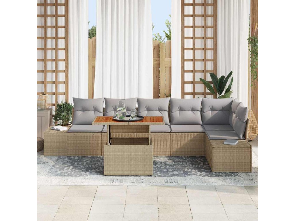 - Vysoce kvalitní materiály: Kombinovaný poly ratan pro jeho UV-odolnost a práškově lakovaná ocel pro robustnost, tento zahradní set zajišťuje dlouhověkost a krásu i v drsném počasí. Povrch z masivního akáciového dřeva poskytuje teplý dotek, elegantně kontrastující s ostatními materiály a nabízí lesklý povrch.