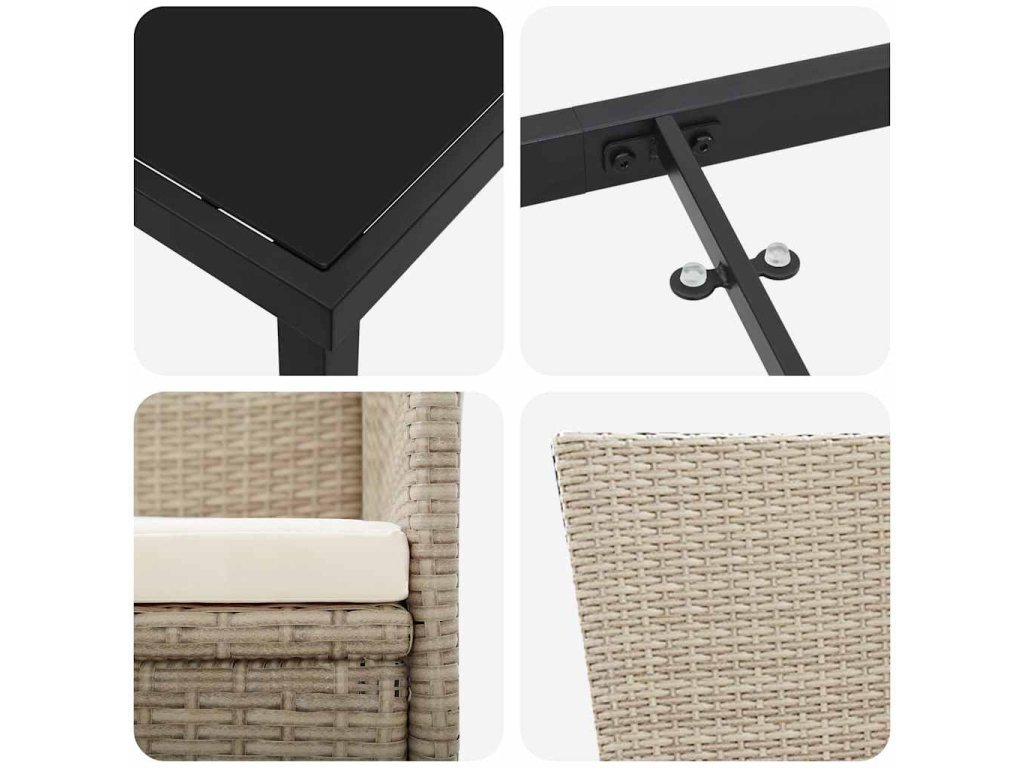 - Materiály: Sestavené z odolného polyratanu, tohle zahradní posezení je připraveno čelit všem podmínkám. Tvrzené sklo dodává šmrnc. Práškově lakované ocelové prvky zajišťují pevnost a odolnost vůči počasí, takže set vydrží!