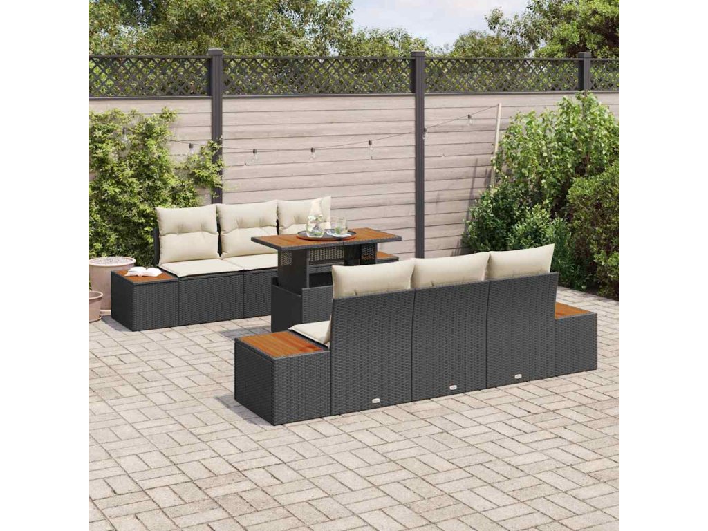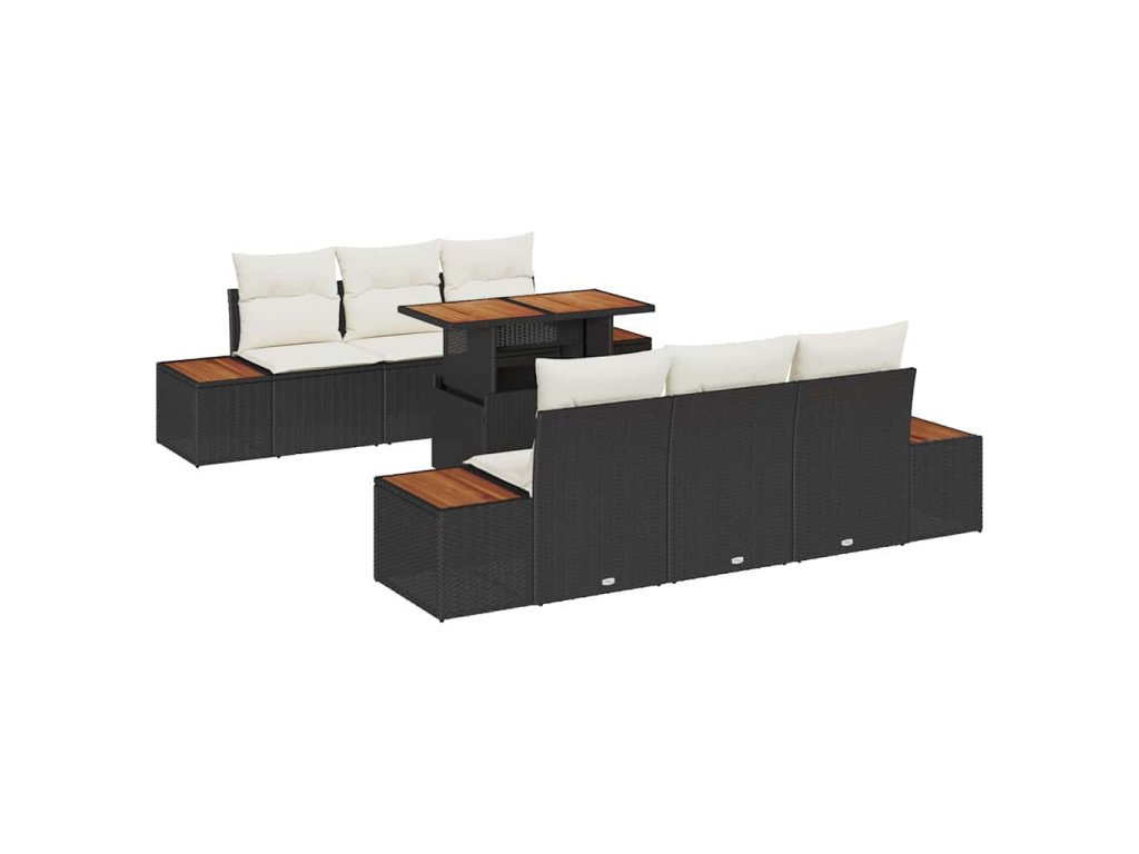 - Materiály: Vyrobený z kvalitního poly ratanu, tento set vydrží různé počasí a má elegantní, moderní vzhled. Pevný ocelový rám, potažený práškovou barvou, brání rzi, zatímco akáciové dřevěné povrchy dodávají stylový prvek, kombinující trvanlivost s estetikou.