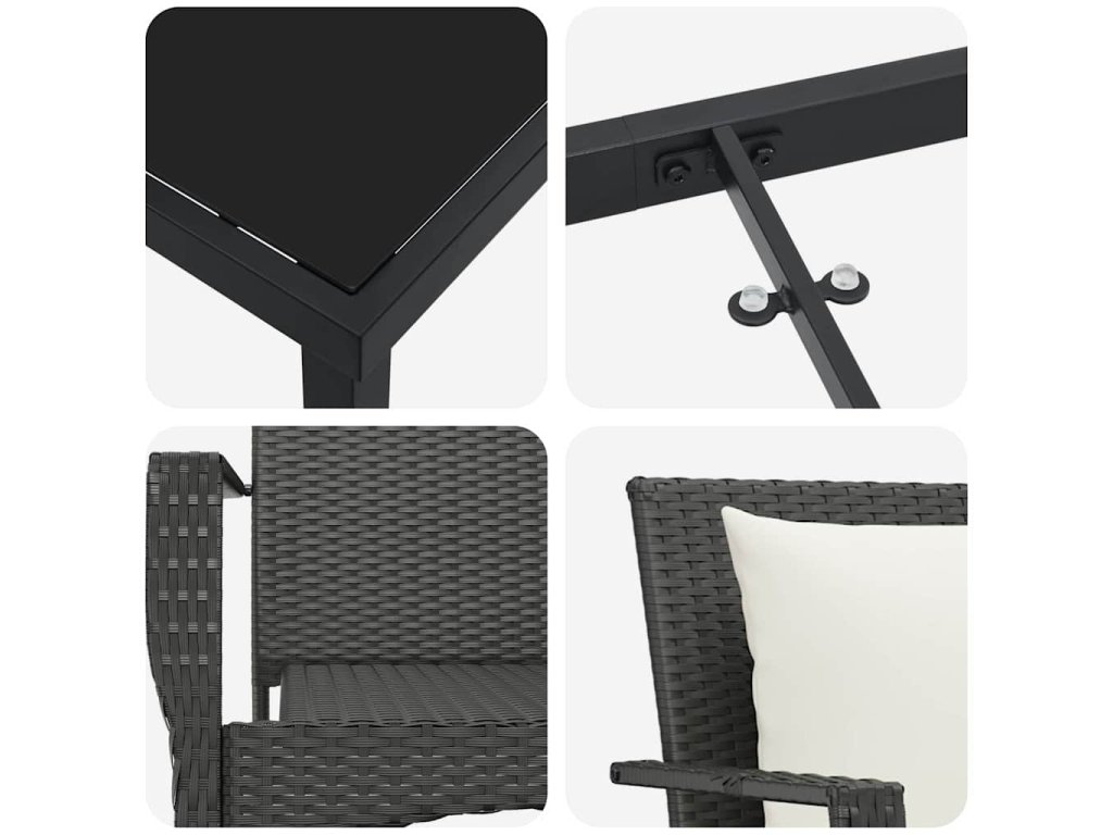 - Odolné materiály: Vyrobeno z odolného polyratanu a práškově lakované oceli. Tvrzené sklo dává stolu stylový vzhled a je připraveno na každodenní používání. Polyratanové křesla jsou pohodlná a nohy zajišťují stabilitu.