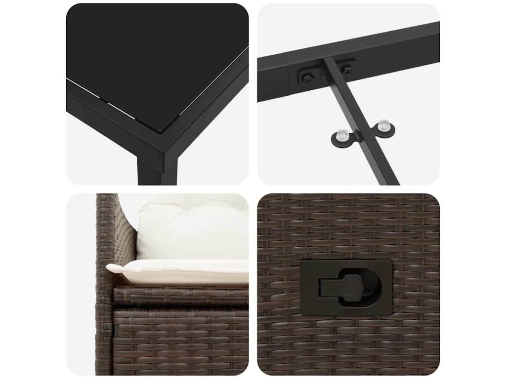 - Materiály z polyratanu Zahradní jídelní set je vyrobený z odolného polyratanu, který je UV stabilní a dlouho vydrží. Dlouho si zachovává skvělý vzhled, i za špatného počasí, takže je ideální pro venkovní použití. Textura a pocit polyratanu vytvářejí příjemnou atmosféru pro luxusní venkovní stolování.