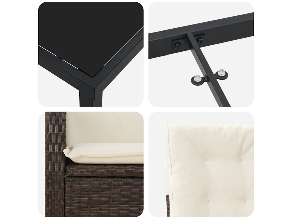 - Odolná konstrukce: Tento set je ze poly ratanu a má ocelové nohy, které poskytují stabilní základy a zajišťují dlouhou životnost. Materiály jsou odolné proti počasí, takže váš jídelní set zůstane v super stavu rok co rok.
