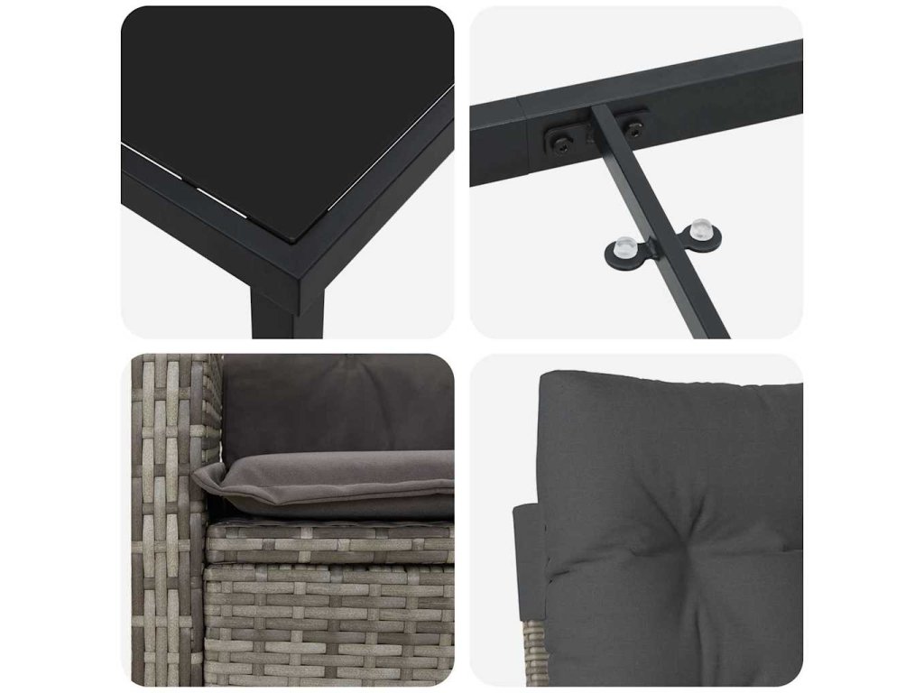 - Materiály: Set je vyrobený z poly ratanu a odolné oceli, zajišťující trvanlivost a eleganci. Poly ratan se přirozeně brání UV záření a špatnému počasí, takže je ideální na slunečné dny, a ocelový rám dodává pevnost a stabilitu pro dlouhodobé používání.