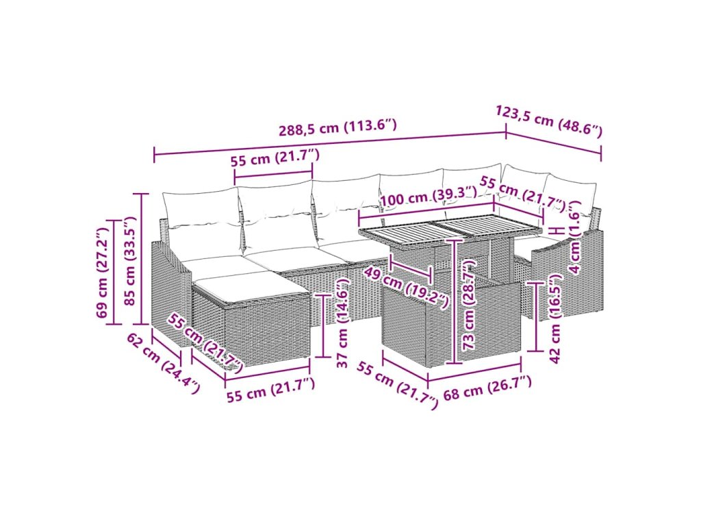 - Praktické komponenty: Vybavena modulárními komponenty, včetně sedadel s úložnými funkcemi a stolu z masivního akáciového dřeva, tato jídelní sada nabízí praktičnost, aniž by obětovala styl. Polyratanové opěrky rukou a udržované zadní části poskytují podporu a ergonomické pohodlí, zatímco poskytované pěnové polštáře nabízejí měkké sezení, čímž zajišťují prodloužené pohodlí během dlouhých jídel nebo rozhovorů.