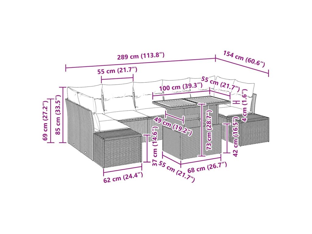 - Součásti: Sada zahrnuje dvě boční pohovky, dvě rohové sedadla a tři střední sedadla, všechny s praktickými funkcemi úložného prostoru. Odpovídající zahradní stůl dokončuje ensemble, poskytující jak pohodlí, tak funkčnost pro venkovní užití.