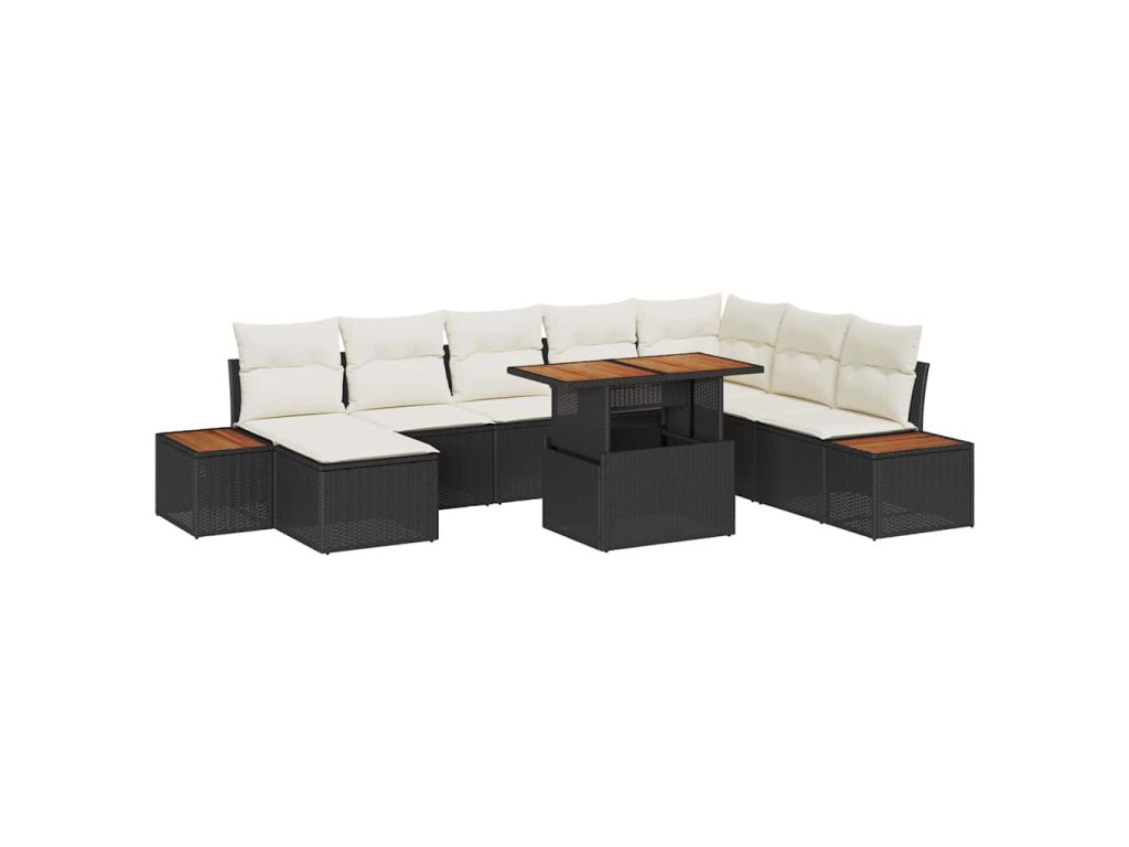 Materiály: Jídelní set je vyroben z trvanlivého poly ratanu, který odolává UV záření a nepříznivým povětrnostním podmínkám. Rám z práškově lakované oceli zajišťuje stabilitu a spolehlivou podporu, zatímco pevný stůl z akáciového dřeva vyzařuje přirozené kouzlo, které zvyšuje jeho vzhled proti odolné ratanové struktuře.,Zahrnuté komponenty: Tato souprava zahrnuje 2 boční pohovky, roh, 4 střední sedáky, taburet a zahradní stůl, každý s vestavěným úložným prostorem. Tyto komponenty umožňují snadné uspořádání doplňků a poskytují bezproblémovou variabilitu v uspořádání vaší zahrady pro různé sociální situace a účely.,Funkce / Design: Užívejte si flexibilitu s nastavitelnými nožičkami, které se přizpůsobí nerovným povrchům a zajistí stabilní jídelní zážitek. Moderní design integruje matný povrch, který zvyšuje estetiku a maximalizuje využití vašeho venkovního prostoru.,Doporučené použití: Ideální pro venkovní stravování za slunečných jarních a letních dnů, modulární povaha tohoto jídelního setu umožňuje snadné přizpůsobení pro různé velikosti skupin. Je perfektní pro rodinné grilování, pořádání přátel nebo prostě pro relaxaci s knihou.,Údržba: Aby se prodloužila životnost tohoto setu, zakryjte ho a nechte uschnout, když ho nepoužíváte. Pravidelné čištění suchým hadříkem udržuje vzhled čerstvý, zajišťující, že zůstává atraktivním středobodem vaší zahrady po mnoho let.- Barva: Černá a béžová