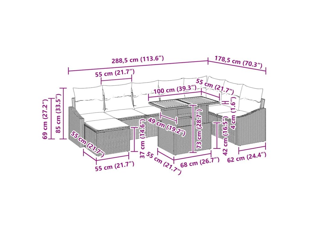 - Součásti: Tato komplexní zahradní souprava spojuje 2 pohovky s područky s úložným prostorem, 1 rohové sedadlo s úložným prostorem, 4 středové sedáky s úložným prostorem, 1 taburet s úložným prostorem a zahradní stůl. Každá součást nabízí více funkcí, což zajišťuje, že je vždy dostatek prostoru a pohodlí pro každého člena vaší rodiny a hosty. Sezení je vybaveno polstrovanými polštáři pro další pohodlí.