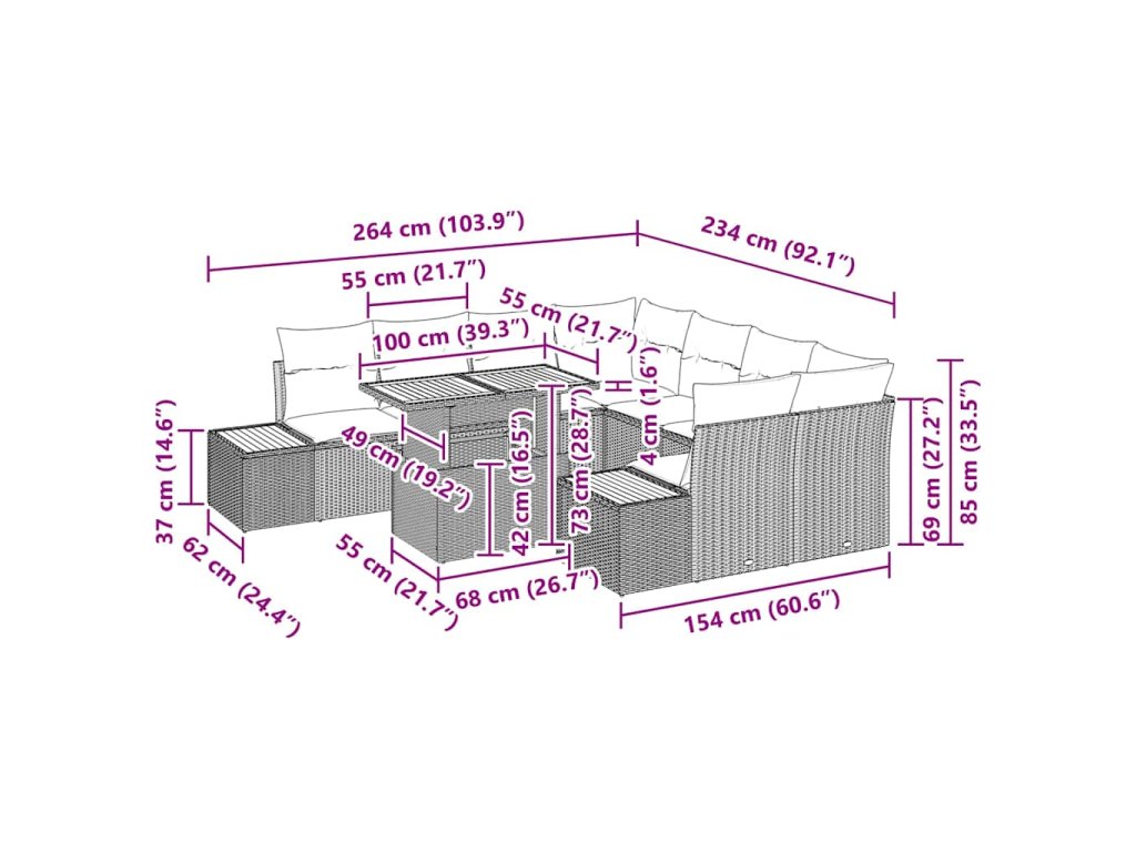 - Funkční komponenty Set je vybaven dvěma bočními pohovkami, dvěma rohovými sedacími částmi a čtyřmi centrálními sedadly, z nichž každé zahrnuje funkci úložného prostoru, což prakticky usnadňuje úsporu místa a zároveň poskytuje pohodlné sezení. Ergonomická opěrka zad, sedací polštáře a madla zajišťují pohodlí při dlouhodobém užití, zatímco odnímatelné potahy polštářů přidávají praktičnost pro čištění a údržbu.