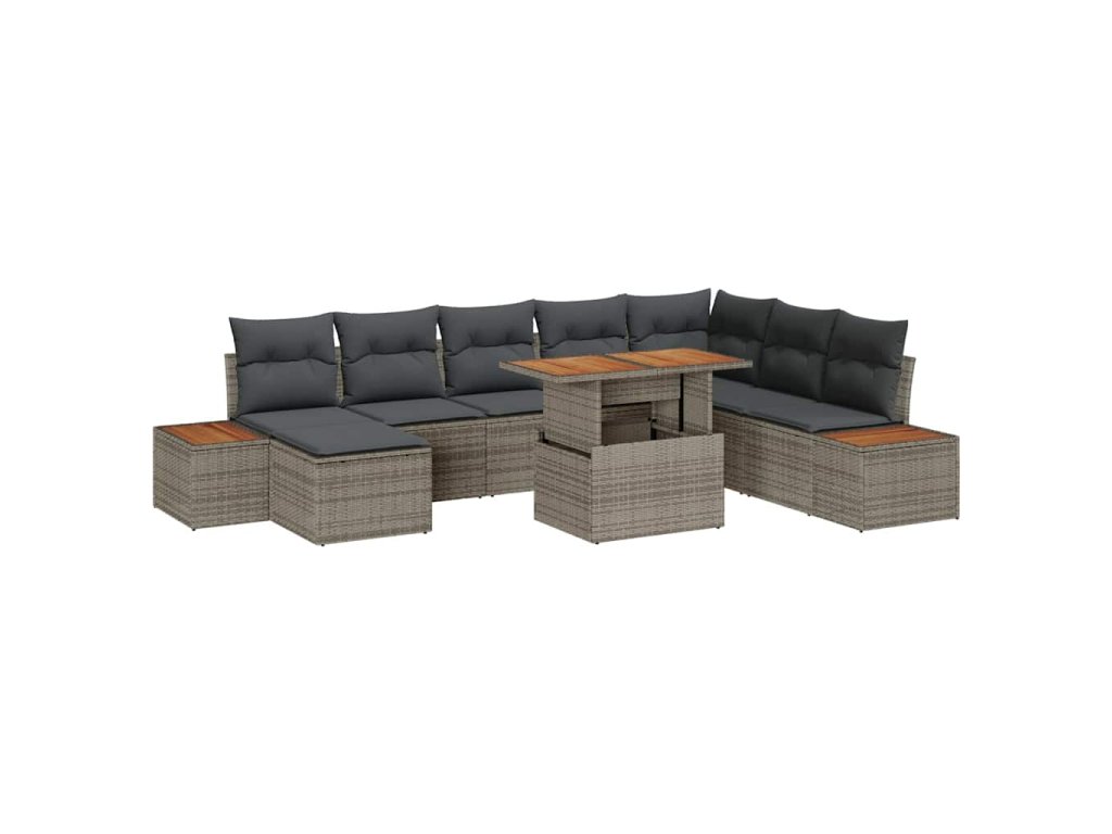 Materiály: Jídelní set je vyroben z trvanlivého poly ratanu, který odolává UV záření a nepříznivým povětrnostním podmínkám. Rám z práškově lakované oceli zajišťuje stabilitu a spolehlivou podporu, zatímco pevný stůl z akáciového dřeva vyzařuje přirozené kouzlo, které zvyšuje jeho vzhled proti odolné ratanové struktuře.,Zahrnuté komponenty: Tato souprava zahrnuje 2 boční pohovky, roh, 4 střední sedáky, taburet a zahradní stůl, každý s vestavěným úložným prostorem. Tyto komponenty umožňují snadné uspořádání doplňků a poskytují bezproblémovou variabilitu v uspořádání vaší zahrady pro různé sociální situace a účely.,Funkce / Design: Užívejte si flexibilitu s nastavitelnými nožičkami, které se přizpůsobí nerovným povrchům a zajistí stabilní jídelní zážitek. Moderní design integruje matný povrch, který zvyšuje estetiku a maximalizuje využití vašeho venkovního prostoru.,Doporučené použití: Ideální pro venkovní stravování za slunečných jarních a letních dnů, modulární povaha tohoto jídelního setu umožňuje snadné přizpůsobení pro různé velikosti skupin. Je perfektní pro rodinné grilování, pořádání přátel nebo prostě pro relaxaci s knihou.,Údržba: Aby se prodloužila životnost tohoto setu, zakryjte ho a nechte uschnout, když ho nepoužíváte. Pravidelné čištění suchým hadříkem udržuje vzhled čerstvý, zajišťující, že zůstává atraktivním středobodem vaší zahrady po mnoho let.- Barva: Šedá a hnědá
