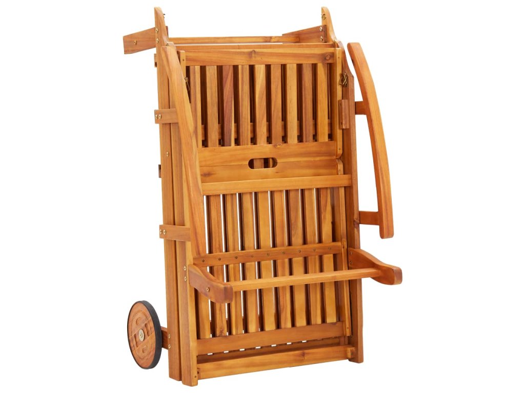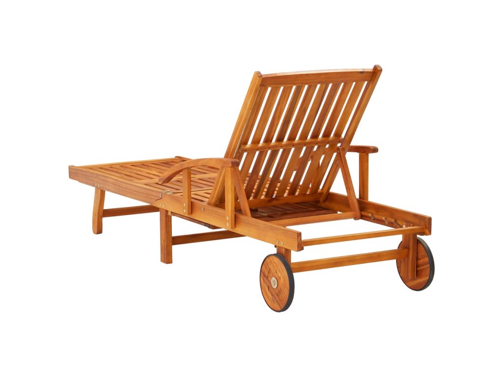 Zahradní lehátko je vyrobené z masivního akáciového dřeva a dobře odolává povětrnostním vlivům, má dlouhou životnost a je vhodné pro venkovní použití. Je vybavené kolečky, takže ho snadno přesunete, kam potřebujete. Opěradlo a opěrka nohou, které jsou nastavitelné od zcela vzpřímeného sedu až po vodorovnou polohu vleže, vám poskytnou maximální pohodlí. Když ho nepoužíváte, lze lehátko sklopit. Přiložená poduška není pouze praktickým doplňkem, ale má také dekorativní funkci.