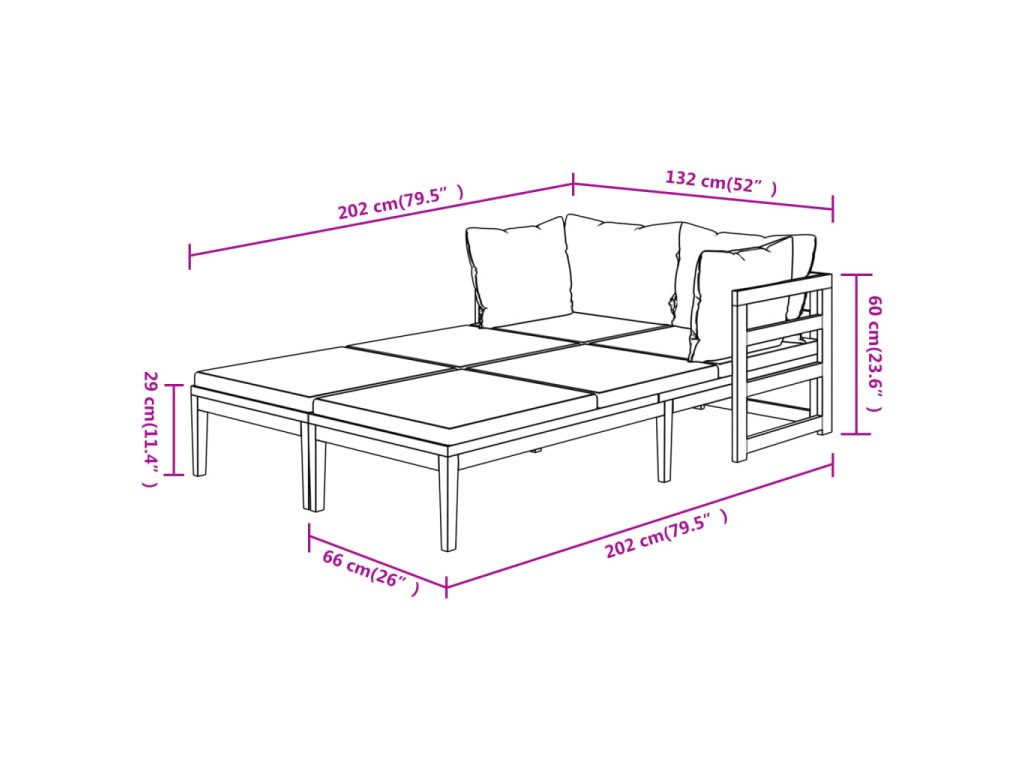 - Rozměry každého zahradního lehátka: 202 x 66 x 60 cm (D x Š x V)