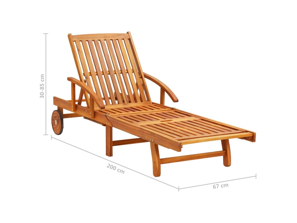 Zahradní lehátko i stolek jsou vyrobené z masivního akáciového dřeva, takže jsou bytelné a stabilní. Lehátko má 2 kolečka, po kterých se dá snadno přemisťovat. Opěradlo a opěrka nohou jsou nastavitelné, abyste si ho mohli zajistit v požadované poloze. Výsuvný odkládací stolek je perfektním místem pro telefon, sluneční brýle, nápoje a další drobné předměty. Poduška přináší extra dávku komfortu pro chvíle odpočinku. Každou podušku můžete k lehátku pevně přivázat šesti páry provázků.
