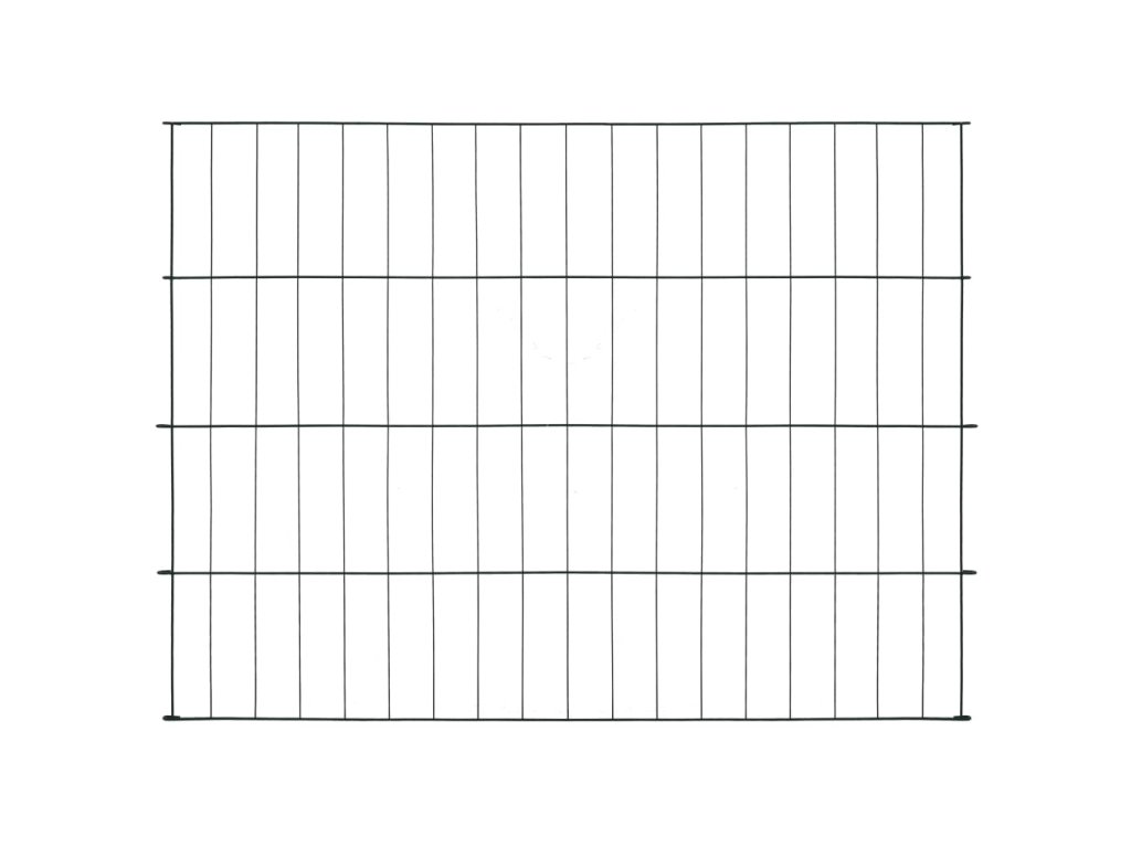 Plot je vyrobený z práškově lakovaného ocelového drátu, který je odolný vůči rzi a vydrží vám venku spolehlivě sloužit po dlouhá léta. Jeho instalace je snadná – stačí zatlouct robustní fixační sloupky, jež se nachází po stranách průchodek jednotlivých plotových dílců, pevně do země.