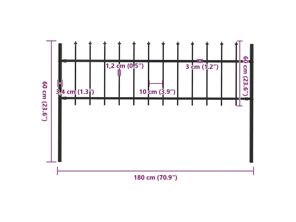 Náš zahradní plot tvoří svislé pruty nahoře zakončené hroty a pevné vodorovné výztuhy, které rám zpevňují. Poskytuje vysokou míru zabezpečení. Je zhotovený z vysoce odolné oceli ošetřené práškováním, a tudíž je výjimečně stabilní, pevný a dlouhodobě odolný. Sestavení zahradního plotu je snadné, veškerý montážní materiál je totiž součástí balení.