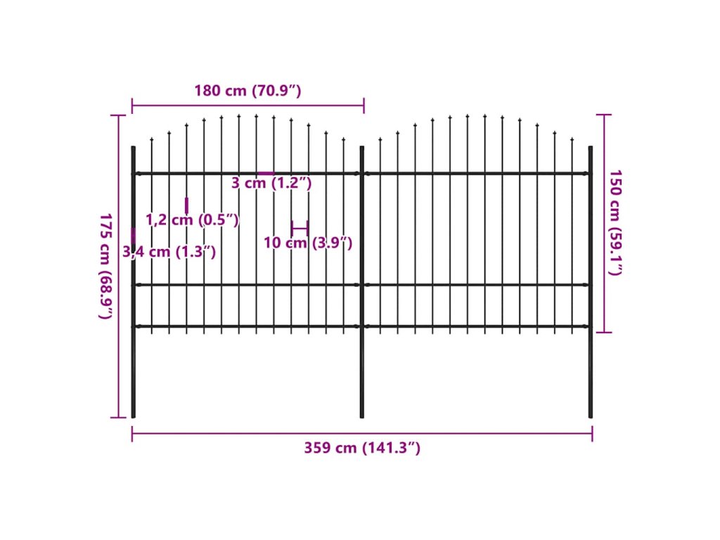 Zahradní plot s kopím nahoře ocelový 359 x 175 cm černý 277740