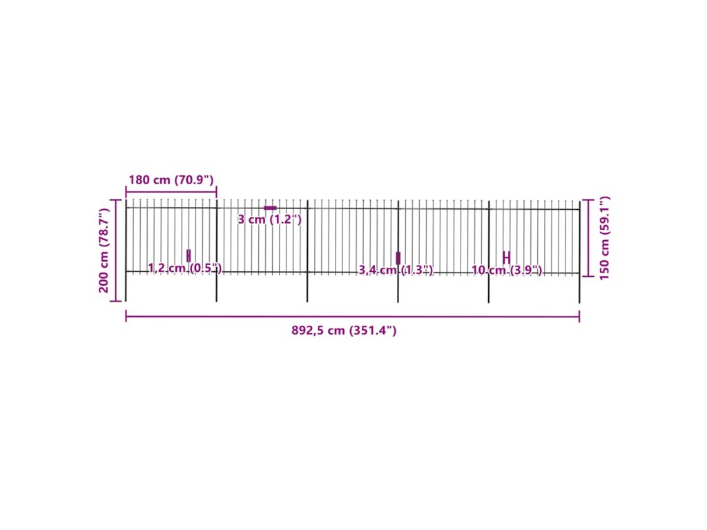 Zahradní plot s kopím nahoře ocelový 892,5 x 150 cm černý 277633