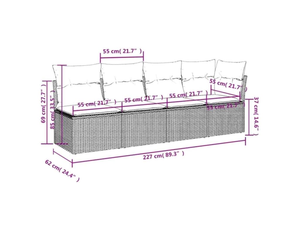 - Celkové rozměry pohovky: 227 x 62 x 69 cm (Š x H x V)