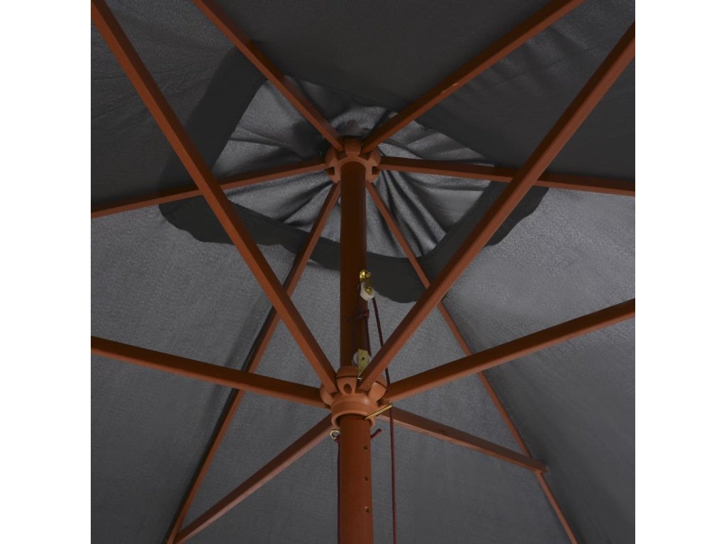 Stříška slunečníku je vyrobena z polyesterové tkaniny, která nepropouští škodlivé UV záření a nevybledne, a poskytne vám optimální ochranu před sluncem. Navíc se snadno čistí. Průměr tyče je 38 mm a můžete ji namontovat na stávající stojan nebo doprostřed stolů, které na ni mají otvor. Silná dřevěná tyč s 6 odolnými žebry zajišťuje, že se slunečník nehýbe a hodně toho vydrží. Zahradní slunečník disponuje kladkovým systémem, což znamená, že se snadno otevírá i zavírá. Sestavení výrobku je jednoduché.