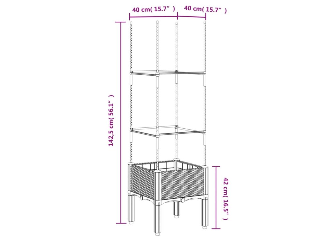 - Praktický design: Ideální dno pomáhá zadržovat vlhkost a umožňuje snadný odvod vody. Vestavěná treláž navíc nabízí oporu pro růst popínavých rostlin, jako jsou rajčata, hrášek nebo růže.