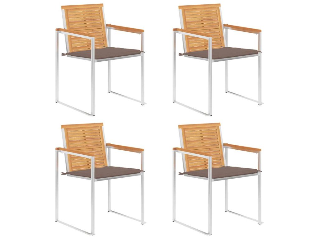 Nábytek je zhotovený z extrémně odolného teakového tvrdého dřeva, které již prošlo procesem smršťování, bylo uměle vysušené a poté jemně a dohladka obroušené. Teakové dřevo je oceňované pro svou výjimečnou pevnost a klimatickou odolnost, a proto je jedním z nejoblíbenějších materiálů pro výrobu zahradního nábytku. Je to skvělá volba, pokud si chcete pořídit venkovní výbavu, která vám vydrží sloužit dlouhá léta. Vzhledem k rámu z vysoce kvalitní nerezové oceli jsou židle zároveň robustní a odolné vůči korozi. Přiložená poduška slouží nejen jako praktický doplněk – plní také dekorativní funkci. Posaďte se a dopřejte si venku skvělou večeři nebo si jen tak odpočiňte a užívejte si počasí s touto klasickou sadou zahradních židlí.
