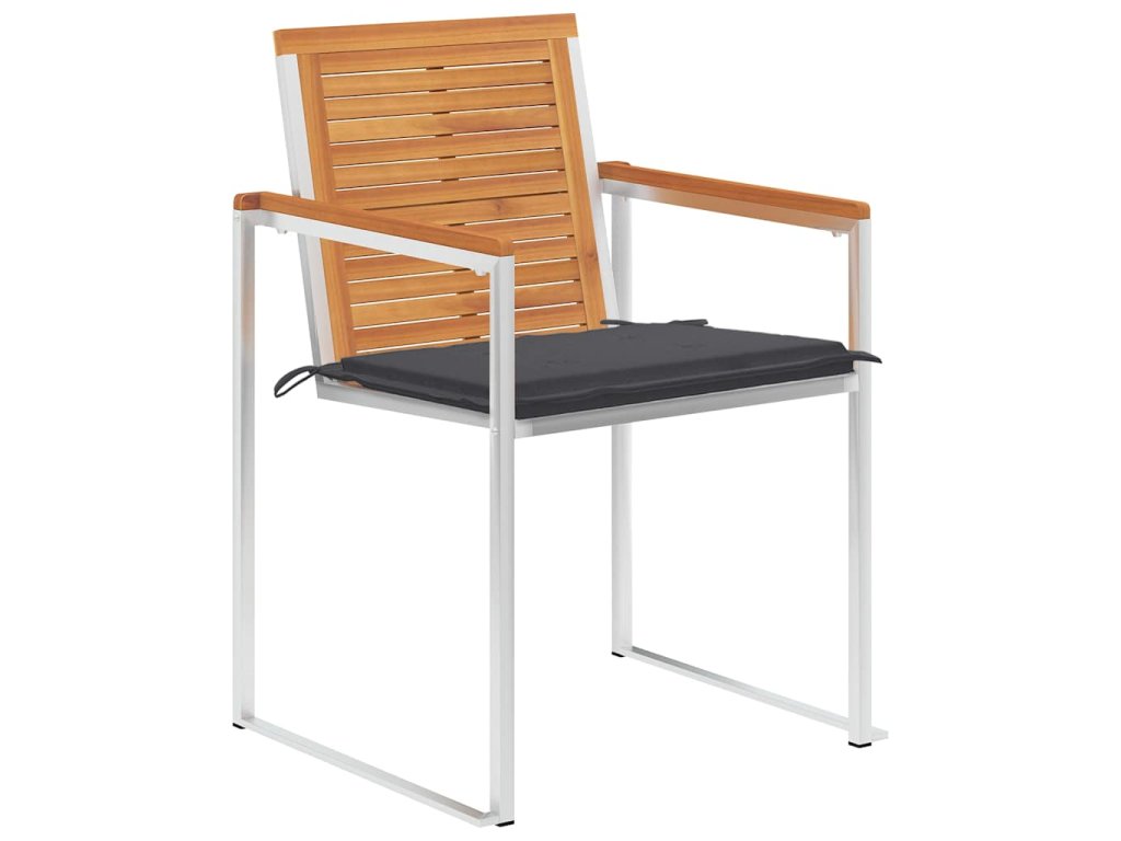 Jídelní židle jsou vyrobeny z masivního akáciového dřeva a vysoce kvalitní nerezové oceli, takže jsou vysoce odolné, nerezavějící, robustní a snadno se čistí vlhkým hadříkem. Přiložená poduška je více než jen praktickým doplňkem, plní také dekorativní funkci. Posaďte se k příjemné večeři pod širým nebem nebo jen relaxujte a užívejte si počasí s touto klasickou sadou zahradních židlí.