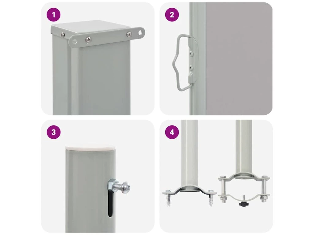 Zástěna je vyrobená z polyesteru, který je odolný proti UV záření a netrhá se. Kazeta, z níž boční markýzu snadno roztáhnete, je ve vertikální pozici posazená na bytelné ocelové základně. Markýza rovněž disponuje funkcí automatického srolování. Její sestavení je jednoduché.