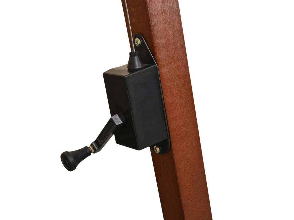 Střecha volně visí z rámu. Tyč tím pádem nepřekáží v prostoru pod slunečníkem. Slunečník se díky klikovému mechanismu snadno otevírá a zavírá.