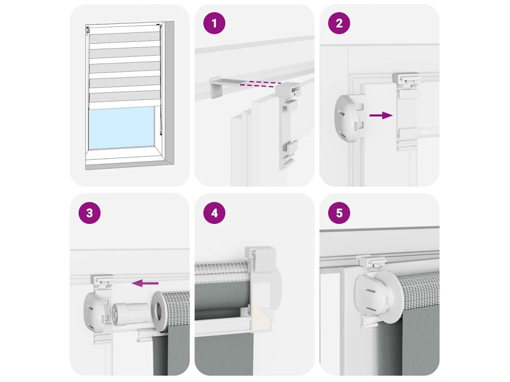 - Dva způsoby montáže: Podle potřeby můžete roletu zebra připevnit na stěnu nebo okno pomocí šroubů nebo bez vrtání pomocí upínacích konzol.