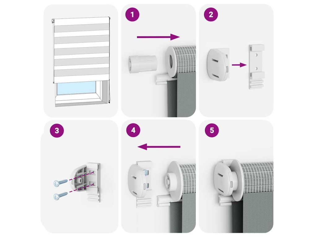 - Dva způsoby montáže: Podle potřeby můžete roletu zebra připevnit na stěnu nebo okno pomocí šroubů nebo bez vrtání pomocí upínacích konzol.