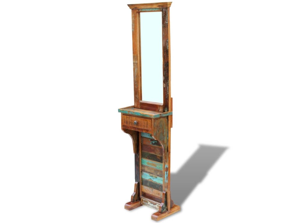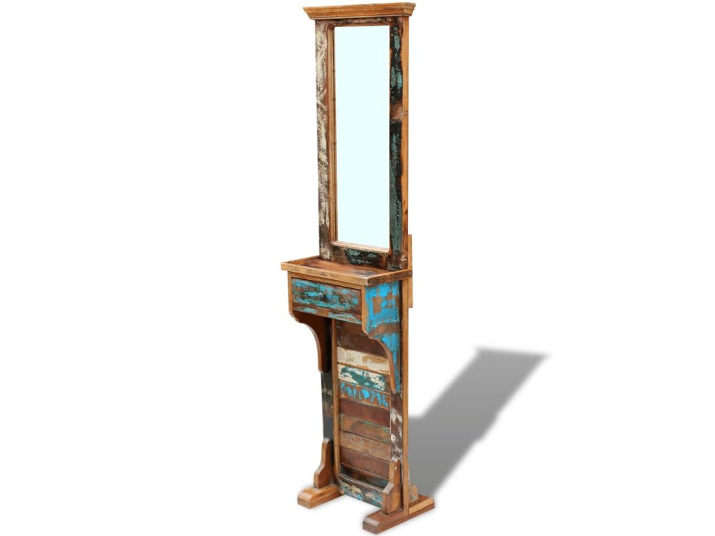 Toto vysoké zrcadlo do předsíně v retro stylu je vyrobené z krásného a odolného materiálu, masivního recyklovaného dřeva, které má typické vlastnosti různých druhů dřeva, jako je teak, mangovník, akácie, recyklované dřevo, tvrdé dřevo apod. Do zásuvky pod zrcadlem se vejde spousta vašich cenností. Pestrý nátěr celého rámu dodává zrcadlu estetický vzhled, a to je tak zároveň praktickým doplňkem i atraktivní dekorací do vašeho interiéru.