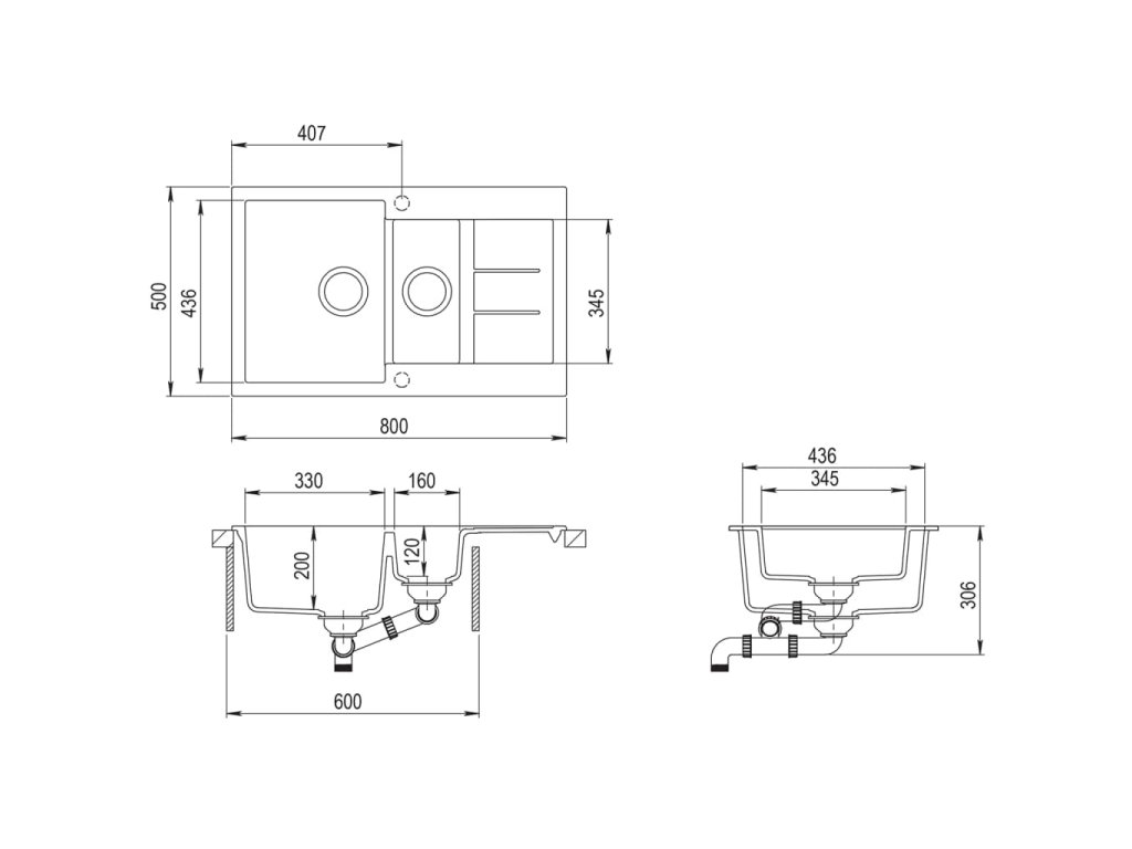 - Rozměry velkého dřezu: 330 x 436 x 200 mm (D x Š x H)